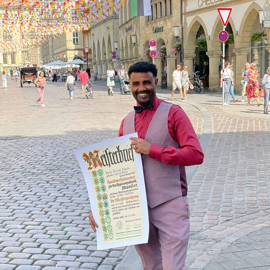 Mein Name ist Wolde Michael Tekola, ich bin verheiratet und habe zwei Söhne sowie eine Tochter. Geboren wurde ich in Eritrea, jedoch bin ich in Äthiopien aufgewachsen. Bevor ich nach Deutschland kam, verbrachte ich fünf Jahre als selbstständiger Friseur im Sudan, wo ich mein Handwerk verfeinerte.